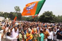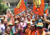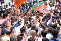 BJP workers and supporters celebrating in front of BJP office during 2018 Karnataka legislative assembly election results, in Bengaluru on Tuesday 15th May 2018