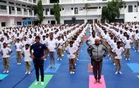 Governor of Karnataka Vajubhai Vala and Former Indian Cricketer Venkatesh Prasad performs yoga to mark the 4th International Day of Yoga, in Bengaluru on Thursday 21st June 2018