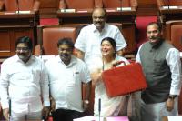 Minister Jayamala arriving with the budget briefcase to present the budget for the Year 2018 at Council session at Vidhan Soudha, in Bengaluru on Thursday 5th July 2018
