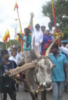 | Event Details: | Vatal Nagaraj with students riding a bullock cart in protest, demanding for free bus pass for students at Majestic Bus Stand, in Bengaluru on Saturday 21st July 2018 |