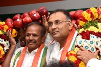 Chairman of the Congress Committee for Fisheries of Karnataka Lingaraju being greeted by KPCC President Dinesh Gundu Rao and Working President Eshwar Khandre at KPCC, in Bengaluru on Sunday 16th December 2018