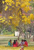 People enjoying under the shelter of blossomed Yellow tabebuia flowers at Cubbon Park, in Bengaluru on Tuesday 5th March 2019