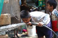 A boy drinking water from the running pipe to beat the heat at Malleshwaram, in Bengaluru on Friday 29th March 2019