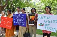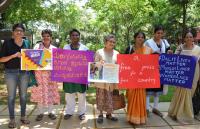 Members of Womens March India display placards during their press meet at Press club, in Bengaluru on Monday 8th April 2019