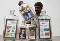 Bottle artist Basavaraj seen showcasing the bottles filled with photographs of PM Narendra Modi and Congress President Rahul Gandhi during the voting awareness campaign at Press Club, in Bengaluru on Friday 12th April 2019