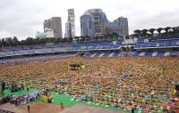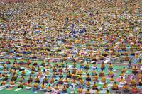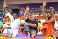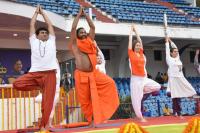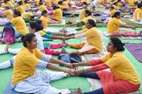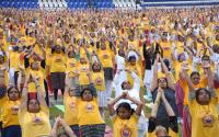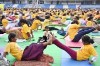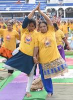 Yoga enthusiasts performing yoga in mass yoga event to mark International Yoga Day at Kanteerva Stadium, in Bengaluru on Friday 21st June 2019