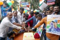 Indian Cricketer, MS Dhoni fans cutting the cake to celebrate his 38th birthday at Press Club, in Bengaluru on Sunday 7th July 2019