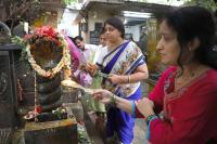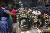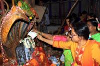 Devotees pouring milk to perform pooja at Naga statue on the occasion of Nagara Panchami at a temple in Malleshwaram, in Bengaluru on Monday 5th August 2019