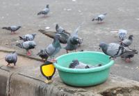 Pigeons seen feeding and soaking in water at a road divider with less traffic at Race Course Road, in Bengaluru on Saturday 17th August 2019