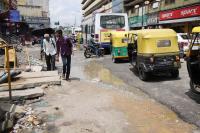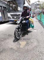 Motorists finding it difficult to ride their vehicles on pothole roads near Majestic, in Bengaluru on Sunday 20th October 2019