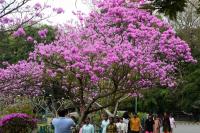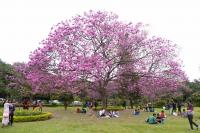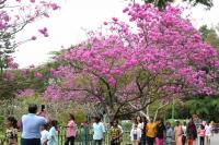 People enjoying the Tabebuia Rosea pink trumpet tree in full bloom at Cubbon Park , in Bengaluru on Wednesday 15th January 2020