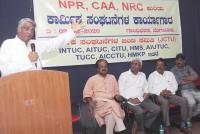 | Event Details: | Senior Advocate Baapu Heddur Shetty with Kalappa, General Secretary, HMKP State Committee, Gopala Gowda, CITU State Committee, Shamanna Reddy, INTUC and Appanna AICCTU during seminar on CAA.and NRC for Workers Association members at a program organised by Joint Committee of Workers Association at Gandhi Bhavan, in Bengaluru on Sunday 9th February 2020 |