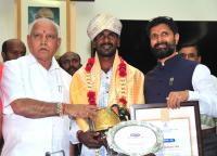 Kambala racer Srinivas Gowda being felicitated by CM BS Yediyurappa and Minister CT Ravi at Vidhan Soudha, in Bengaluru on Monday 17th February 2020