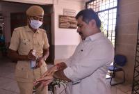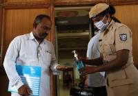 Police personal providing hand sanitisers to the people for Coronavirus outbreak at the entrance of Vidhan Soudha, in Bengaluru on Tuesday 17th March 2020