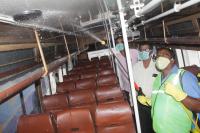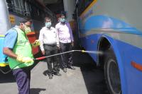 Worker sprays chemical at a bus at Satellite Bus Stand as precaution for Coronavirus, in Bengaluru on Wednesday 18th March 2020