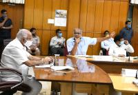 CM BS Yediyurappa with Minister Suresh Kumar and officials during a review meeting on primary and secondary education department at home office Krishna, in Bengaluru on Friday 22nd May 2020