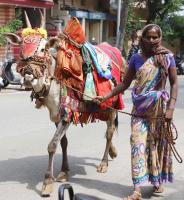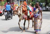 A woman with a cow (Basava) roaming at Shanakara mutt during her rounds for daily bread, in Bengaluru on Thursday 28th May 2020
