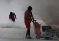 Workers cutting concrete road to give final touches to the white topping road at Jayanagar, in Bengaluru on Thursday 4th June 2020