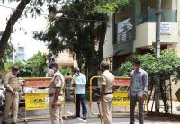 Police personnel security at Education Minister Suresh Kumar residence at Basaveshwaranagar following NSUI protest against SSLC exams, in Bengaluru on Saturday 20th June 2020