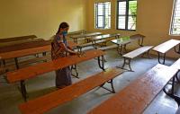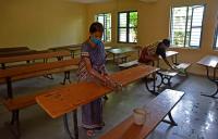 | Event Details: | School workers cleaning desks with disinfectants inside a classroom ahead of SSLC exams at Basaveshwara College, during the fifth phase of nationwide COVID-19 Coronavirus lockdown, in Bengaluru on Tuesday 23rd June 2020 |