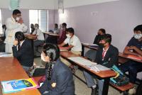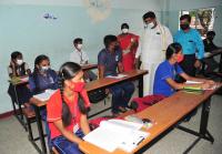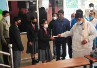 Minister Gopalaiah interacting with SSLC students during his visit to SSLC exam centre at Mahalakshmi Layout to check the safety precautions for Coronavirus, in Bengaluru on Thursday 25th June 2020