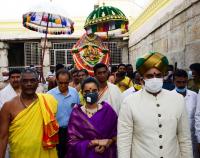 Yaduveer Krishnadatta Chamaraja Wadiyar , Maharaja of Mysore seen with wife Trishika seen at the Vardhanti of Goddess Chamundeshwari at Chamundeshwari Temple at Chamundi Hills in Mysuru on Monday 13th July 2020