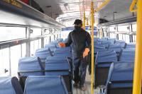 A worker spray disinfectant on KSRTC bus at Kempegowda Bus stand, in Bengaluru on Monday 13th July 2020