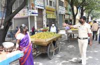 | Event Details: | Police personnel asking the vegetable and fruit vendors on footpaths to shut the shops at SJB road, as Karnataka Government announced one week lockdown in Bengaluru City due to surge in COVID-19 Coronavirus cases, in Bengaluru on Monday 20th July 2020 |