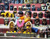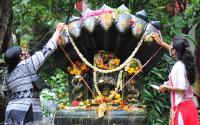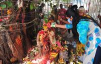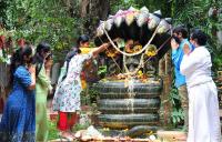 Devotees perform pooja at Naga statues on the occasion of Naga Panchami at a temple, in Bengaluru on Saturday 25th July 2020