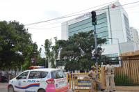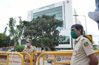 Police personnel stand guard at Manipal Hospital where CM, BS Yediyurappa is admitted after testing positive for Corona Virus, in Bengaluru on Monday 03 August 2020