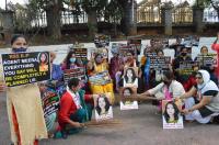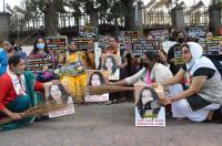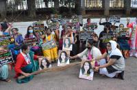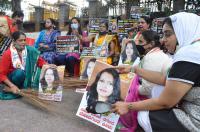 Members Congress stage protest against Meera Raghavendras alleged social media posts at Congress Bhavan , in Bengaluru on Monday 17th August 2020