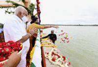 Chief Minister of Karnataka BS Yeddiyurappa with MP Sumalatha offered Bagina to river Cauvery at KRS Dam, in Mysuru on Friday 21st August 2020