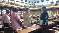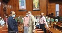 Speaker Vishweshwara Hegde Kageri with Minister Madhuswamy and Chief Secretary Vijayabhaskar inspect assembly hall preparation ahead of the Assembly session at Vidhana Soudha, in Bengaluru on Monday 24th August 2020