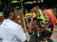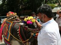 KPCC President DK Shivakumar performing pooja to a cow at his Sadashinagar Residence during Ayudha Pooja and Vijayadashami festival, in Bengaluru on Sunday 25th October 2020