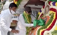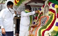 Vatal Nagaraj paying floral tribute to Nada Devate Bhuvaneshwari during Kannada Rajyotsava celebrations, in Bengaluru on Sunday 1st November 2020