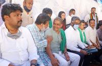 BMTC Chairman Nandish Reddy and MLA SR Vishwanath interacting with Kodihalli Chandrashekar and leaders of BMTC and KSRTC workers Association at Freedom Park during their protest, in Bengaluru on Monday 14th December 2020