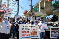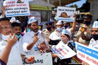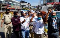 Aam Aadmi Party workers selling tea and pakoda near Sony Circle flyover to protest against state BJP government for delaying of the development works in the state, in Bengaluru on Friday 18th December 2020