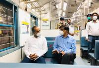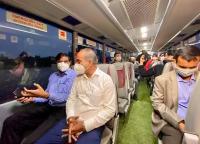 MP PC Mohan and Railway Dept officials travelling airport public train during inaugural ceremony of public train service from City Railway station to Bengaluru International Airport, in Bengaluru on Monday 4th January 2021