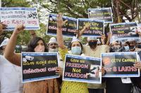 Members of Aam Aadmi Party raise slogans against state government during a protest at SBM Circle, in Bengaluru on Saturday 9th January 2021