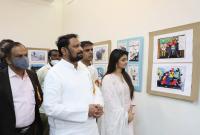 DCM and Transport Minister Laxman Savadi and Actress Srileela and others looking at the cartoon exhibition to create awareness on Road safety at Chitrakala Parishat, in Bengaluru on Friday 12th February 2021