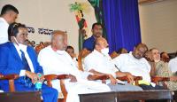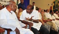 JDS Supremo and Former PM HD Devegowda seen with Former CM HD Kumarswamy and other JDS leaders at the JDS Conference, in Bengaluru on Sunday 14th February 2021
