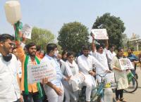 Members of Youth Congress protesting against Central BJP government for hike in fuel and LPG prices, in Bengaluru on Wednesday 17th February 2021