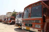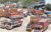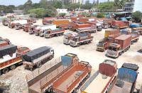Trucks are parked at a terminal in Yeshwanthapur during a nationwide strike protest against rising fuel prices and Goods and Service Tax (GST) rules, in Bengaluru on Friday 26th February 2021