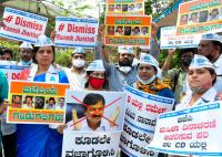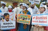 Members of Aam Aadmi Party protesting against Minister of Water Resources GoK Ramesh Jarkiholi for his alleged sex tape, in Bengaluru on Wednesday 3rd March 2021