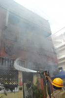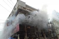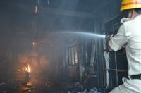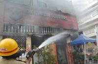 Firemen trying to dose off the fire at Okinawa Scooters store at Sudhamnagar, in Bengaluru on Friday 12th March 2021