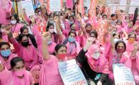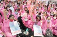 Members of AIUTUC (Anganwadi workers) staging a protest at Freedom Park, to press their various demands, in Bengaluru on Monday 15th March 2021