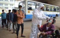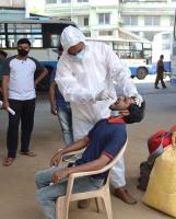 Health workers conducting swab tests at KR Market after surge in new coronavirus cases, in Bengaluru on Thursday 25th March 2021
