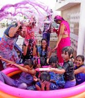 Youngsters smear colored powder and water on each other as they celebrate Holi Festival, in Bengaluru on Monday 29th March 2021