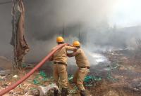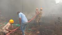 Fire personnel douse the fire caught at a scrap godown near Kumbalgodu, Mysore Road, in Bengaluru on Tuesday 30th March 2021