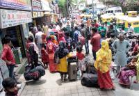 Interstate (migrant) workers gathered at private bus booking centres to travel to their native places due to surge in covid-19 during Coronavirus pandemic, in Bengaluru on Thursday 15th April 2021